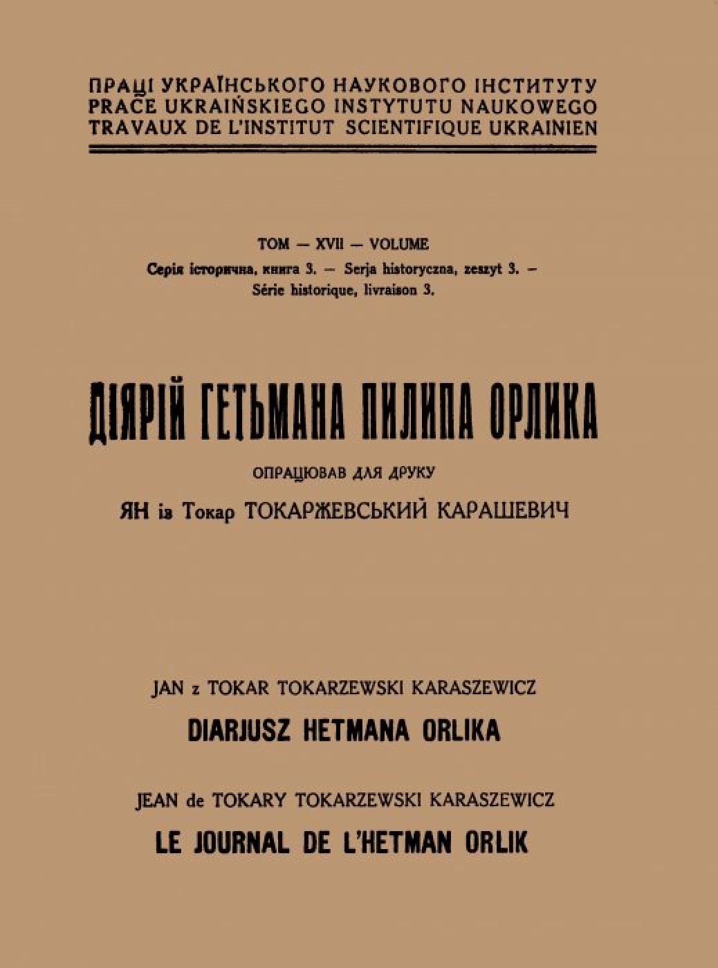 Орлик, Пилип. Діярій гетьмана Пилипа Орлика [Електронна копія] / Опрацював для друку Ян із Токар Токаржевський Карашевич ; [ред. Р. Смаль-Стоцький]. Електрон. текст. дані. Варшава : З друк. Наук. т-ва ім. Шевченка у Львові, 1936 (Київ: НБУ ім. Ярослава Мудрого, 2022). (Праці українського наукового інституту ). (Серія історична; т. 17, кн. 3; кн. 3).