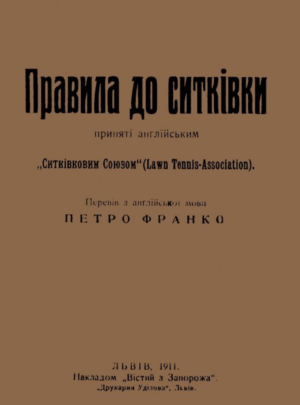 Правила до ситківки [Електронна копія] : прийняті англ. ”Ситківковим Союзом” (Lawn Tennis-Association) / пер. з англ. мови П. Франко. Електрон. текст. дані (1 файл : 49,7 Мб). Львів : Накладом “Вістий з Запорожа”, 1911 (Київ: НБУ ім. Ярослава Мудрого, 2022).
