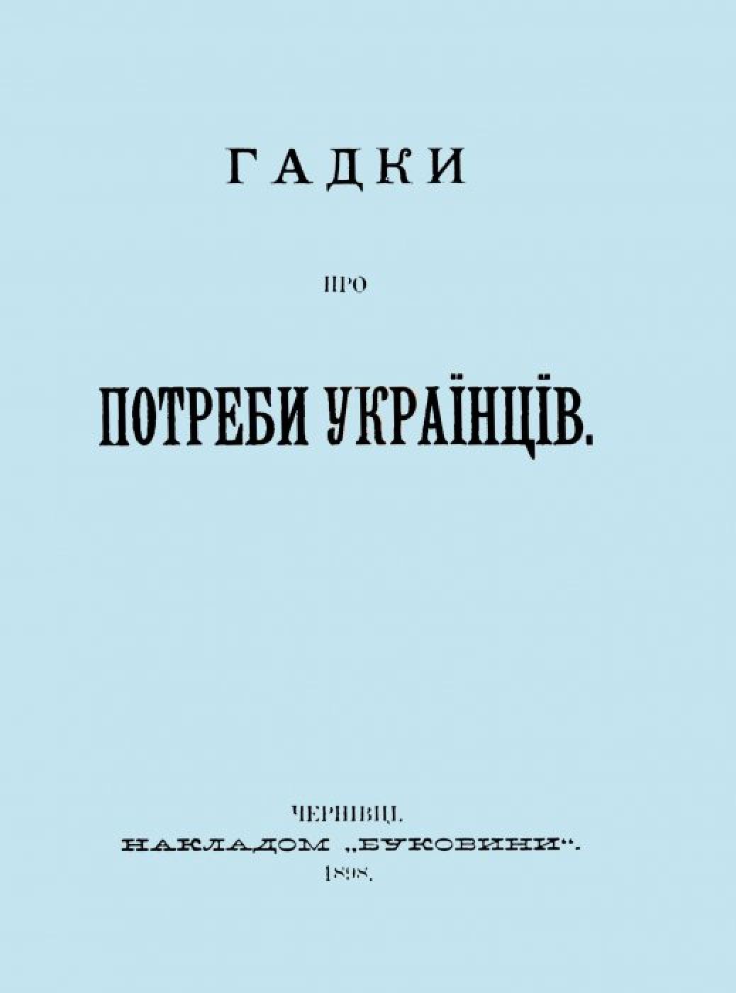 Гадки про потреби українців [Електронна копія]. Електрон. текст. дані (1 файл : 74,5 Мб). Чернівці : Накладом ”Буковини”, 1898 (Київ: НБУ ім. Ярослава Мудрого, 2022).