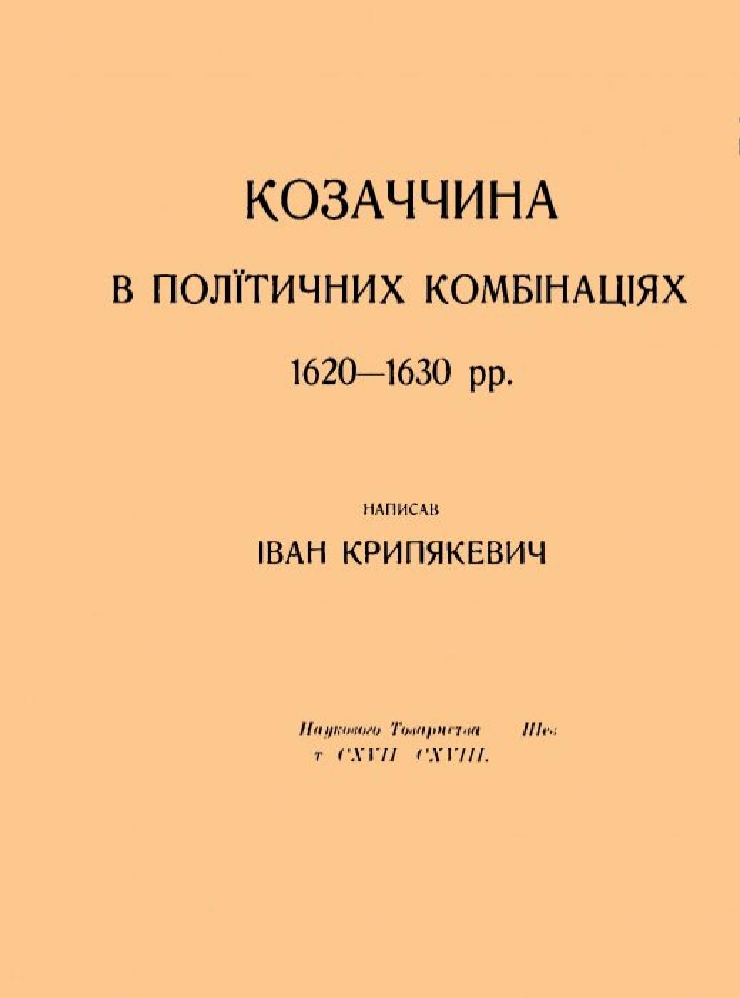 Крипякевич, Іван. Козаччина в політичних комбінаціях 1620-1630 рр. [Електронна копія] : з Записок наукового товариства ім. Шевченка т. 117-118 / написав Іван Крипякевич. Електрон. текст. дані (1 файл : 4,24 Мб). Львів : З Друк. Наук. т-ва ім. Шевченка, 1914 (Київ: НБУ ім. Ярослава Мудрого, 2022).