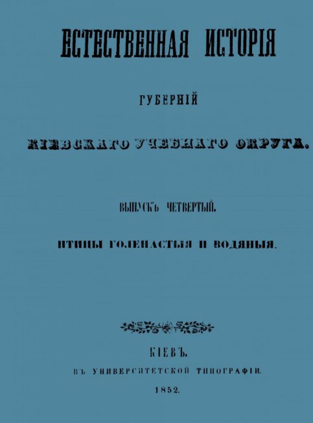 Кесслер, К. Ф. Естественная история губерний Киевского учебного округа. Зоология. Часть систематическая [Електронна копія] / [ст. К. Ф. Кесслера]. Электрон. текст. дан. Киев : В Унив. тип., 1851 (Київ: НБУ ім. Ярослава Мудрого, 2021). (Труды Комиссии Высочайше учрежденной при Императорском Университете Св. Владимира для описания губерний Киевского учебного округа Подольской, Волынской, Киевской, Черниговской и Полтавской). Вып. 4 : [Птицы голенастые и водяные]. Электрон. текст. дан. (1 файл : 11,9 Мб). 1852 (Київ: НБУ ім. Ярослава Мудрого, 2021).