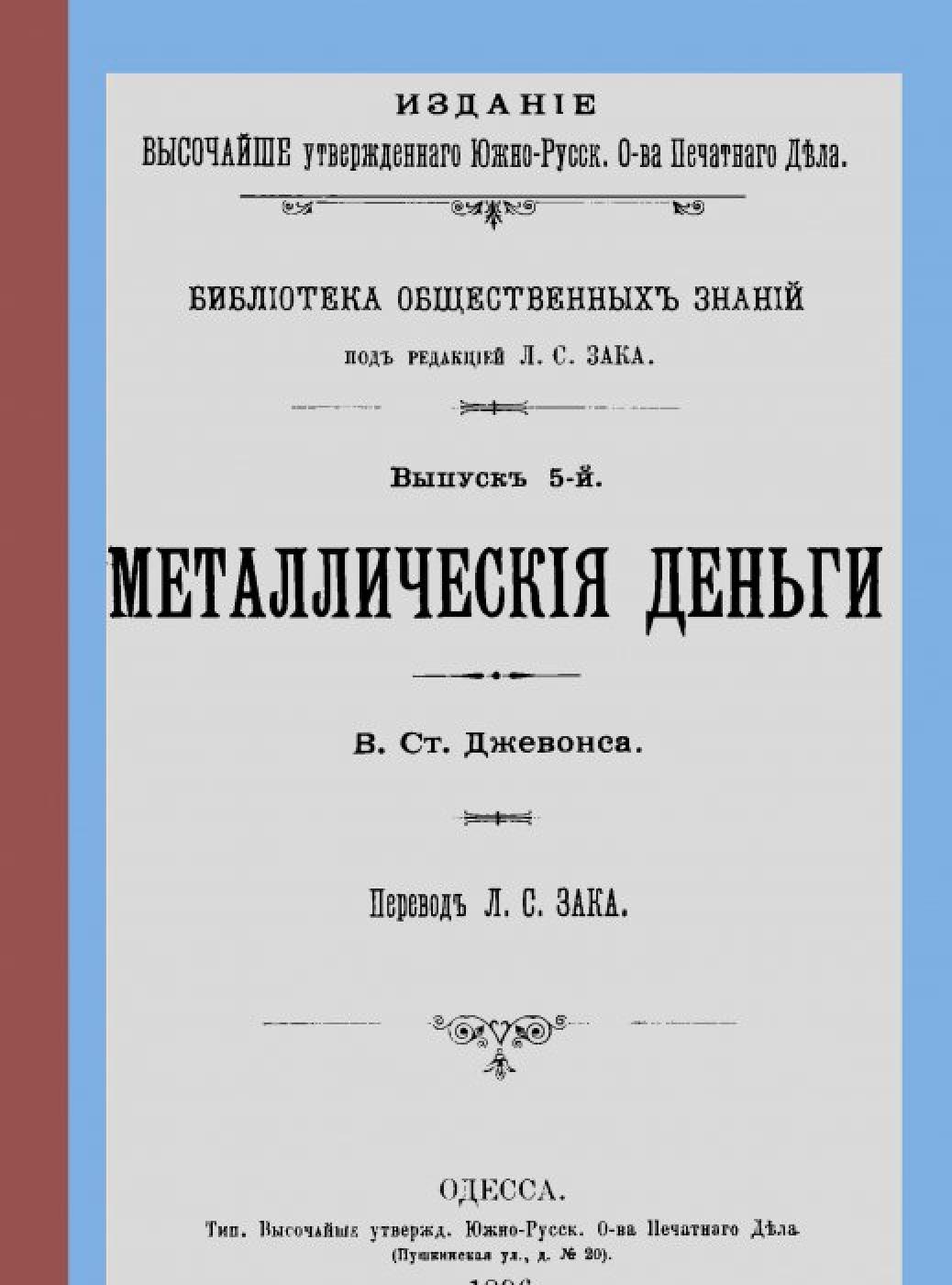 Джевонс, Вильям Стэнли. Металлические деньги [Електронна копія] / [соч.] В. Ст. Джевонса ; пер. [с англ.] Л. С. Зака. Электрон. текст. дан. (1 файл : 42,2 Мб). Одесса : Изд. Юж.-Рус. О-ва печат. дела, 1896 (Київ: НБУ ім. Ярослава Мудрого, 2023). (Библиотека общественных знаний / под ред. Л. С. Зака; вып. 5).