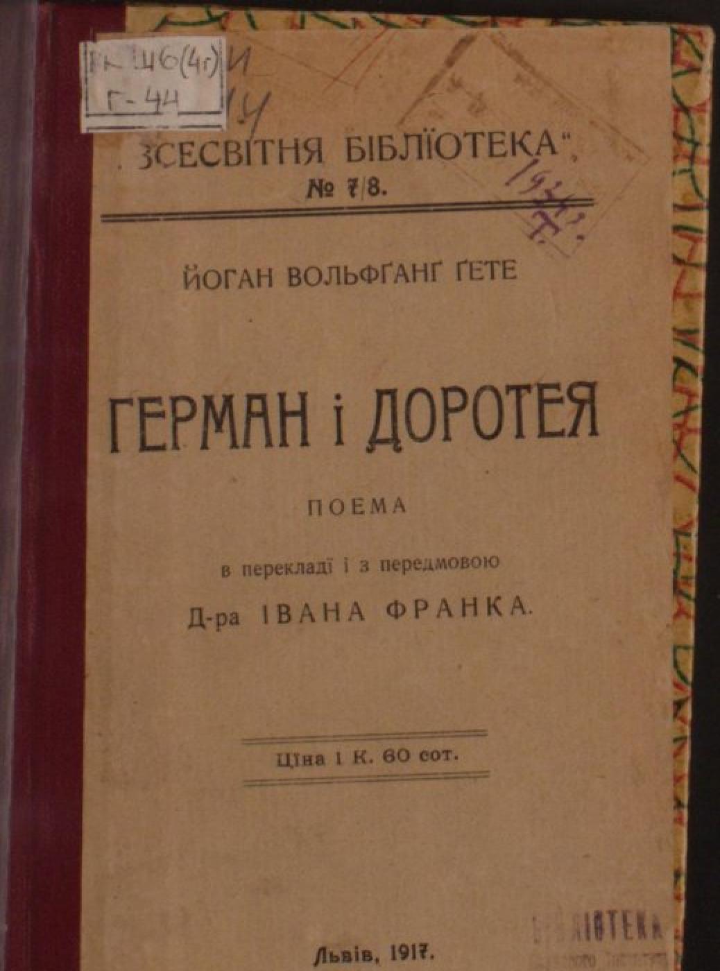Гете, Йоган Вольфганг. Герман і Доротея [Електронна копія] : поема / Гете Йоган Вольфганг ; в пер. і з передм. І. Франка. Електрон. текст. дані (1 файл : 39,8 Мб). Львів : Накладом ”Всесвіт. б-ки”, 1917 (Київ: НБУ ім. Ярослава Мудрого, 2023). (Всесвітня бібліотека; № 7/8).