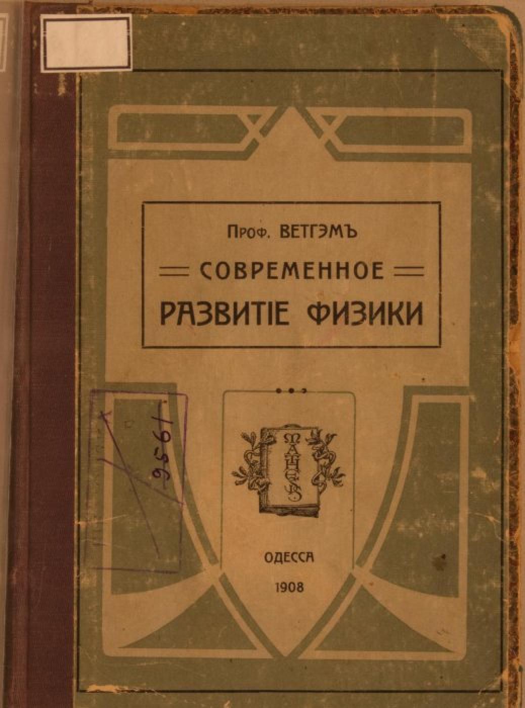Дампье-Ветгэм, Вильям Сесиль. Современное развитие физики [Електронна копія] : с прил. речи первого министра Англии (1902–5) А. Дж. Бальфура ”Несколько мыслей о новой теории вещества” / Ветгэмъ ; пер. с 3-го англ. изд. под ред. Б. П. Вейнберга и А. Р. Орбинского. Электрон. текст. дан. (1 файл : 24,2 Мб). Одесcа : Mathesis, 1908 (Київ: НБУ ім. Ярослава Мудрого, 2023).