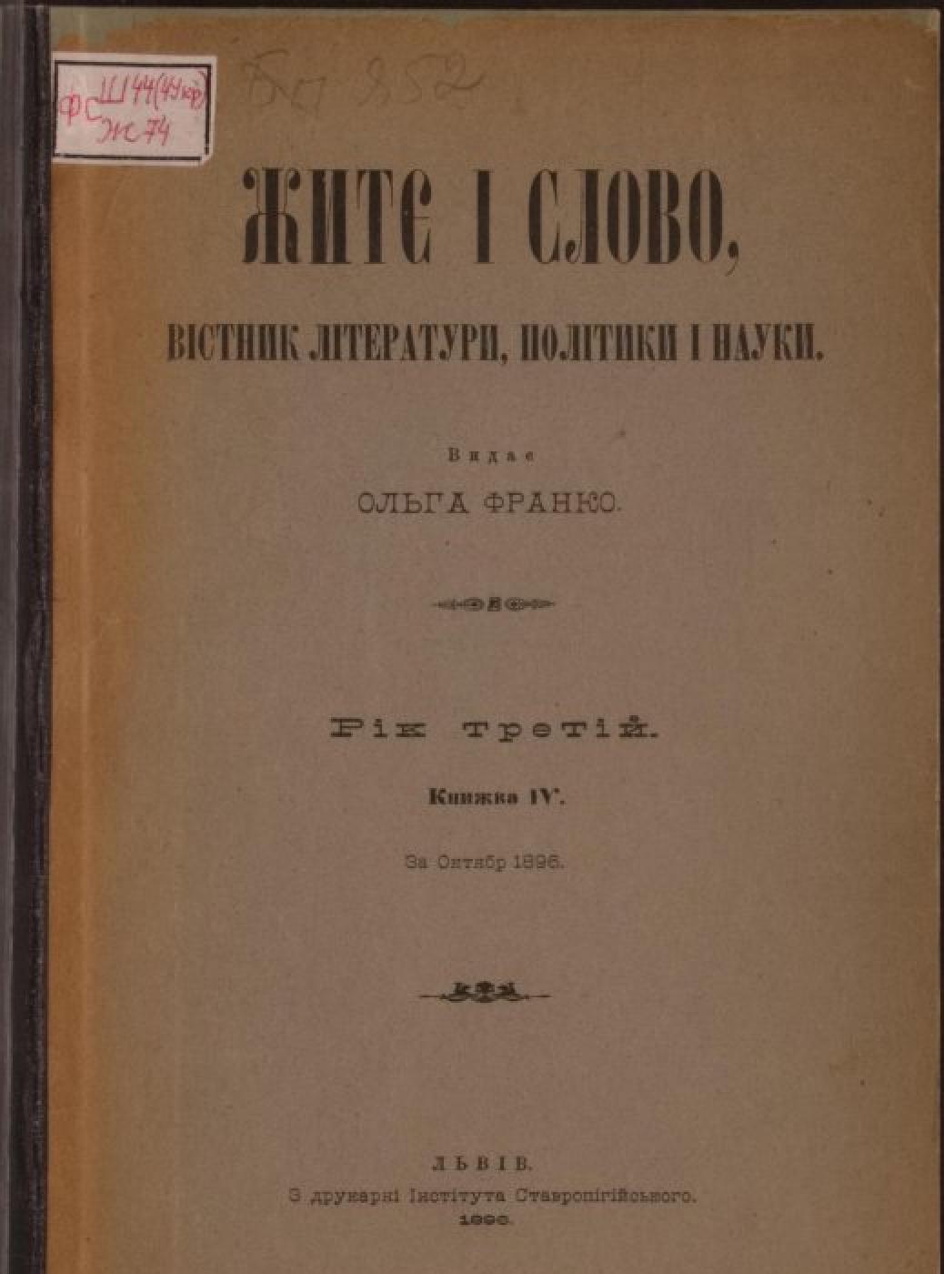 Житє і слово [Електронна копія] : Рік третій. Львів : З друк. ін-та Ставропіг., 1896. Кн. 4 : За октябр 1896. Електрон. текст. дані (1 файл : 13,9 Мб). 1896 (Київ: НБУ ім. Ярослава Мудрого, 2023).