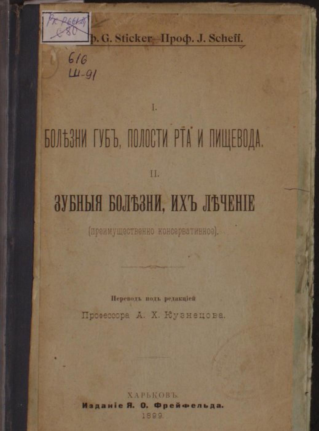 Sticker, G. Болезни губ, полости рта и пищевода ; Зубные болезни, их лечение (преимущественно консервативное) [Електронна копія] / G. Sticker, J. Scheff ; пер. под ред. А. Х. Кузнецова. Электрон. текст. дан. (1 файл : 13,9 Мб). Харьков : Изд. Я. О. Фрейфельда, 1899 (Київ: НБУ ім. Ярослава Мудрого, 2023).