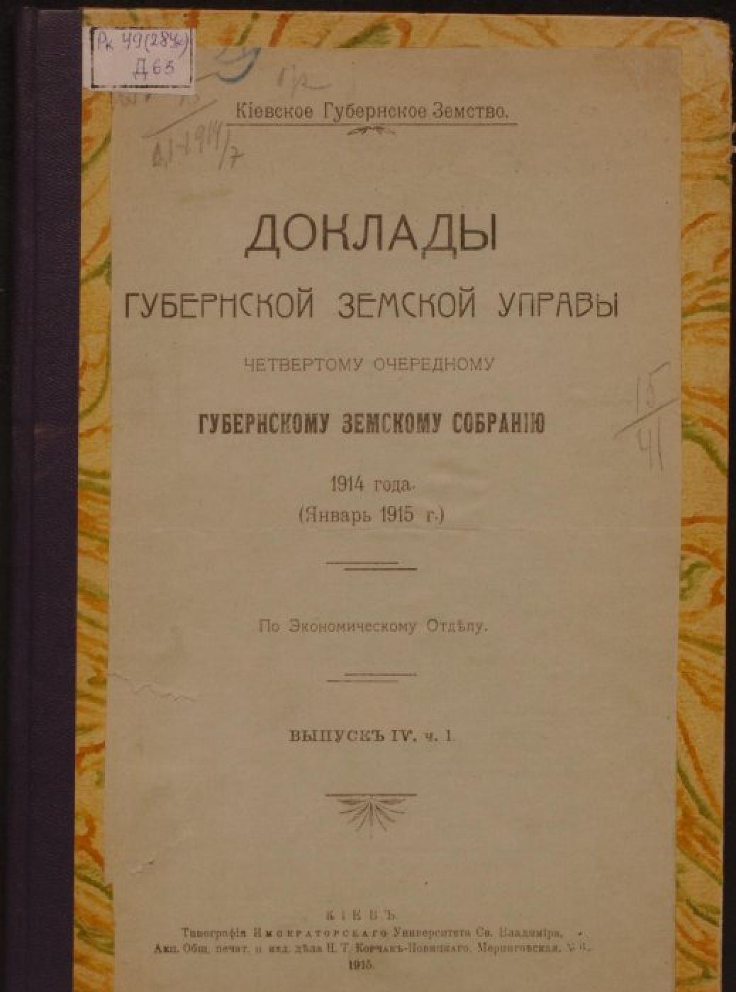 Киевская губернская земская управа. Доклады Губернской земской управы четвертому очередному Губернскому земскому собранию 1914 года [Електронна копія] : (янв. 1915 г.) / Киев. губерн. земство. Киев : Типо-литография насл. К. Ш. Круглянского, 1915 (Київ : НБУ ім. Ярослава Мудрого). Вып. 4, ч. 1 : По экономическому отделу. Электрон. текст. дан. (1 файл : 14,4 Мб). 1915 (Київ: НБУ ім. Ярослава Мудрого, 2023).