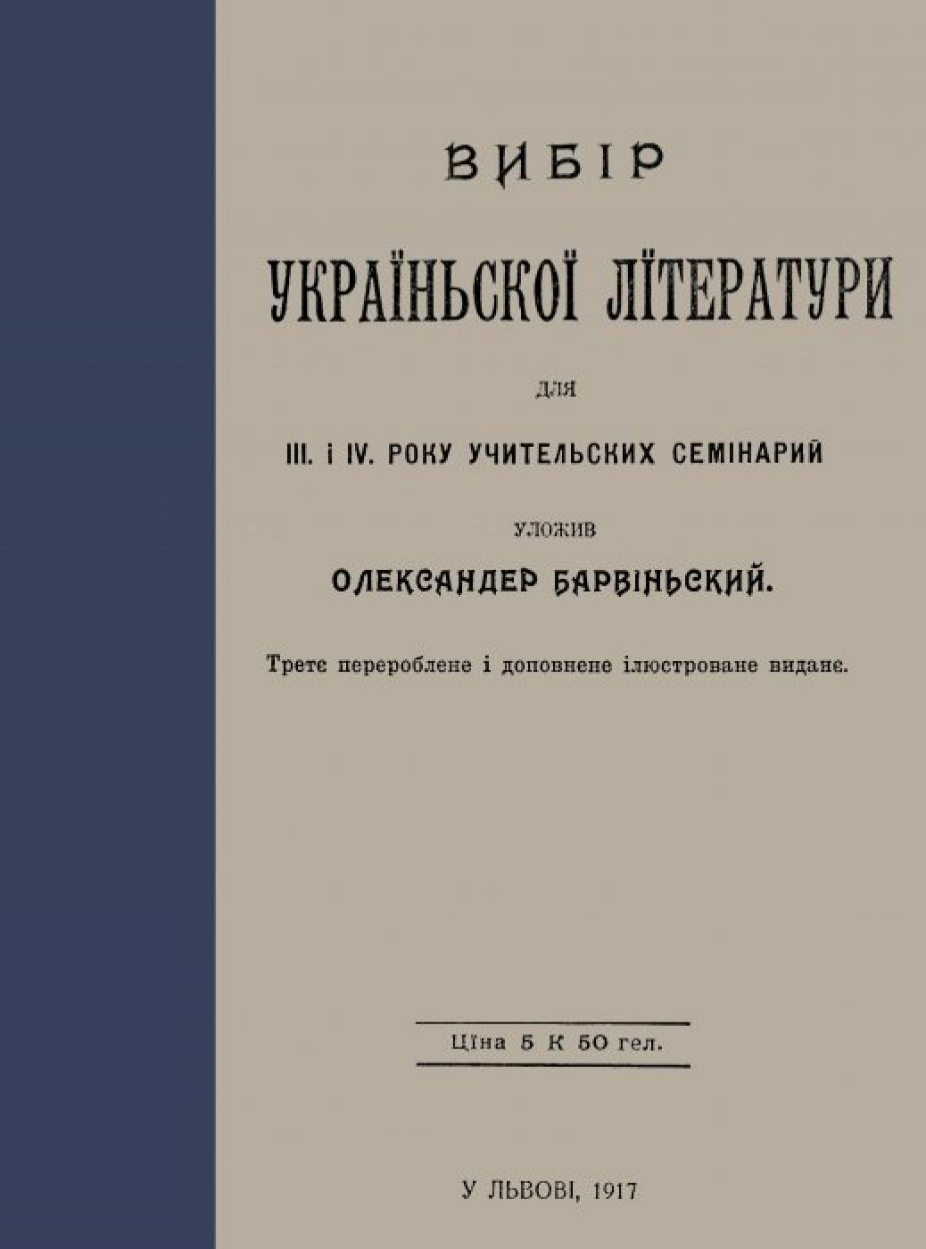 Вибір з української літератури для III і IV року учительских семінарий [Електронна копія] / уложив О. Барвінський. 3-тє переробл. і доповн. іл. вид. Електрон. текст. дані (1 файл : 48,3 Мб). У Львові : Накладом Ц. к. Вид-ва шкіл. книжок, 1917 (Київ: НБУ ім. Ярослава Мудрого, 2021).