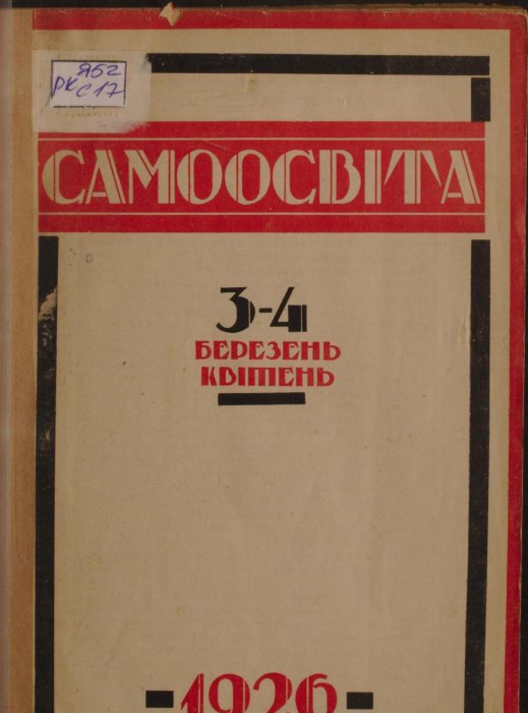 Самоосвіта [Електронна копія] : орган Центр. коміс. допомоги самоосвіті, АПВ ЦКЛКСМУ, від. самоосвіти УПО, культвід. ВУРПС : [журнал]. Харків : Держ. вид-во України, 1926 (Київ : НБУ ім. Ярослава Мудрого). № 3-4 : Березень-Квітень. Електрон. текст. дані (1 файл : 37,7 Мб). 1926 (Київ: НБУ ім. Ярослава Мудрого, 2023).