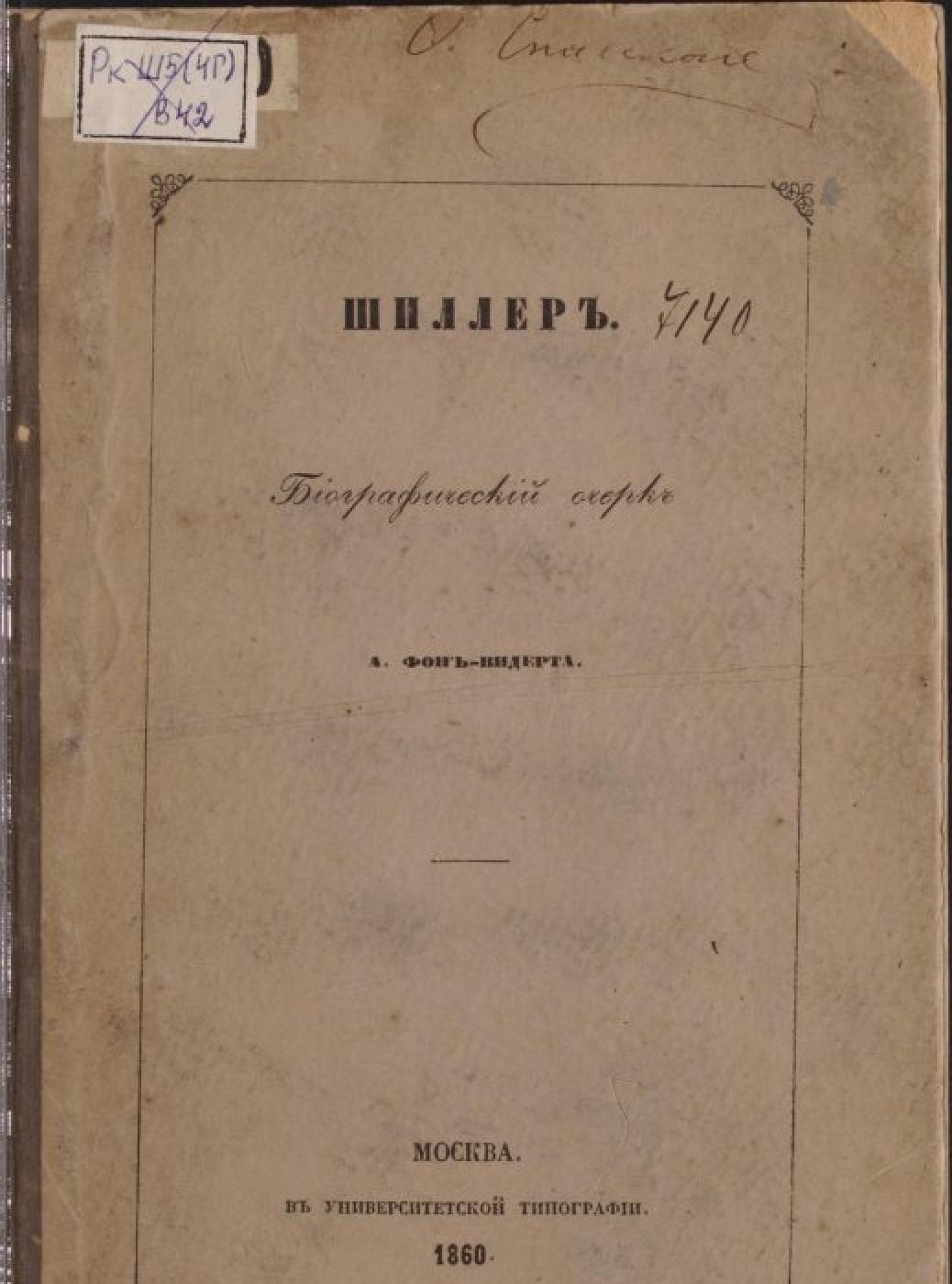 Видерт, Август Федорович фон. Шиллер [Електронна копія] : биогр. очерк / [соч.] А. фонъ-Видерта. Электрон. текст. дан. (1 файл : 29,9 Мб). М. : В унив. тип., 1860 (Київ: НБУ ім. Ярослава Мудрого, 2024).
