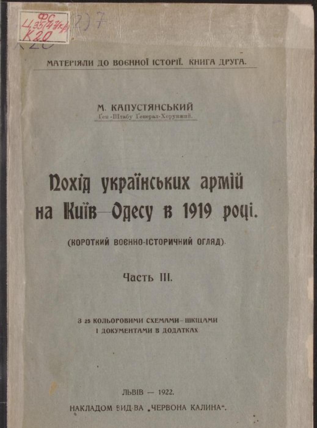 Капустянський, М. Похід українських армій на Київ – Одесу в 1919 році [Електронна копія] : (короткий воєн.-іст. огляд) / М. Капустянський. Електрон. текст. дані. Львів : Накладом вид-ва «Червона калина», 1922 (Київ: НБУ ім. Ярослава Мудрого, 2024). (Матеріали до воєнної історії). Ч. 3 : Електрон. текст. дані (1 файл : 2,94 Мб). 1922 (Київ: НБУ ім. Ярослава Мудрого, 2024). (Матеріали до воєнної історії; кн. 2).