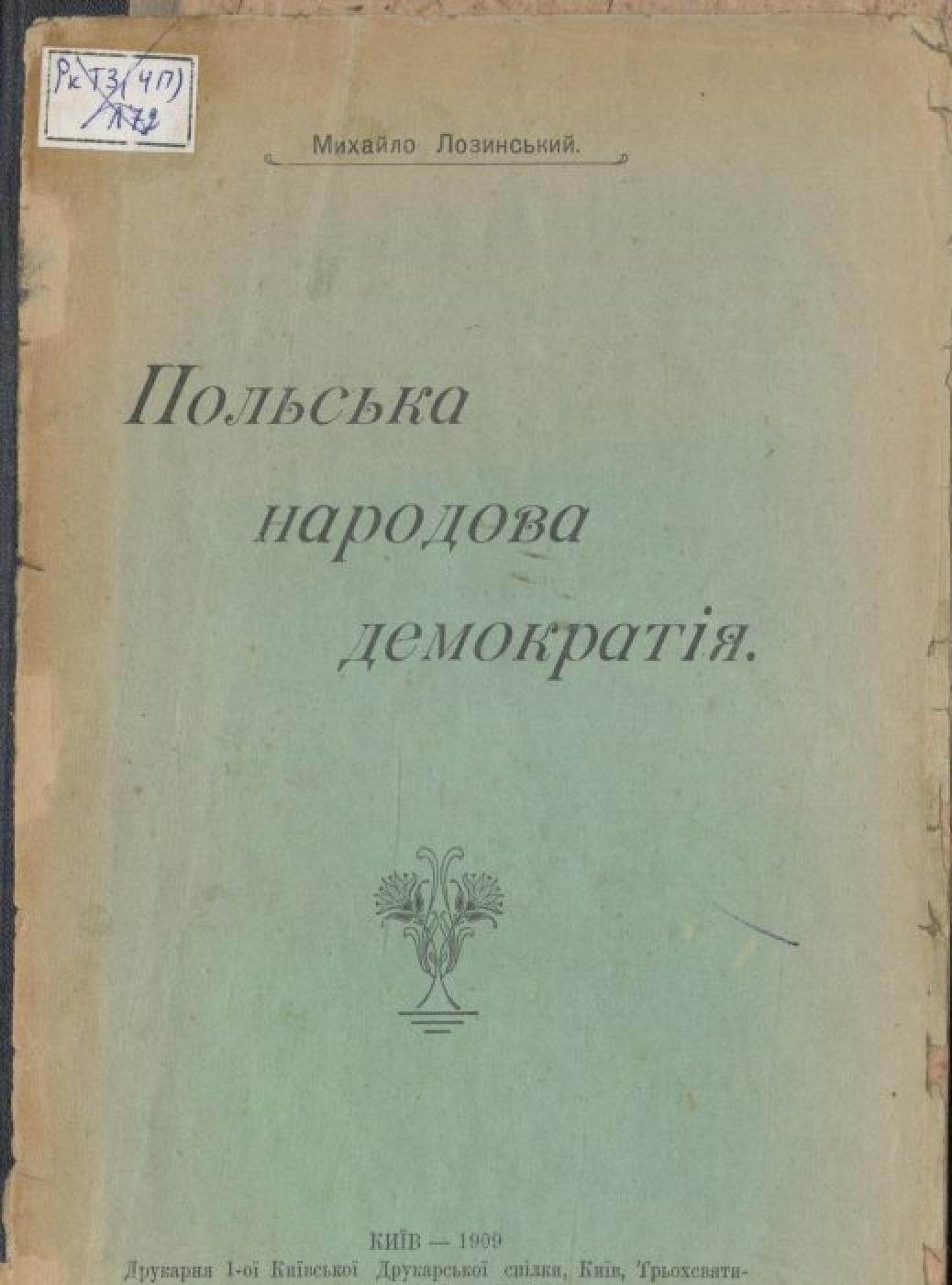 Лозинський, Михайло. Польська народова демократія [Електронна копія] / Михайло Лозинський. Електрон. текст. дані (1 файл : 8,62 Мб). Київ : Друк. 1-ї Київ. друк. cпілки, 1908 (Київ: НБУ ім. Ярослава Мудрого, 2024).