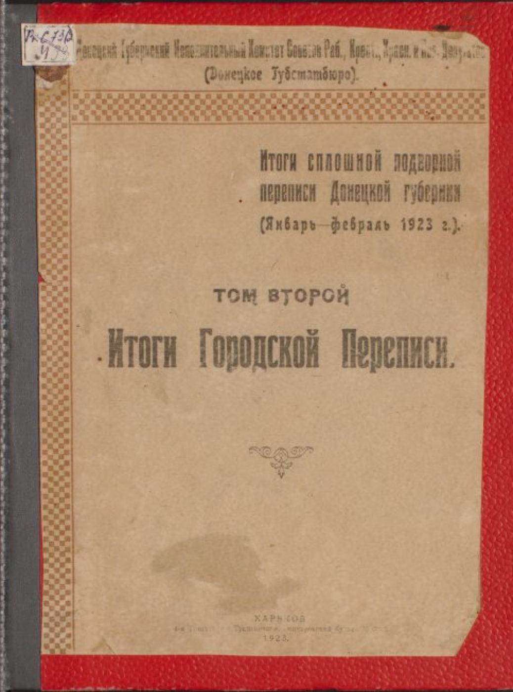 Итоги сплошной подворной переписи Донецкой губернии [Електронна копія] : (янв.-февр. 1923 г.) / Донец. губерн. исполнит. ком. Сов. раб., крест., красн. и каз. депутатов (Донец. губстатбюро) ; [предисл.: С. Мазлах]. Электрон. текст. дан. Харьков : Изд. Книгоизд-ва ”Донбасс”, 1923 (Київ: НБУ ім. Ярослава Мудрого, 2024). Т. 2 : Итоги городской переписи. Электрон. текст. дан. (1 файл : 13,4 Мб). 1923 (Київ: НБУ ім. Ярослава Мудрого, 2024).
