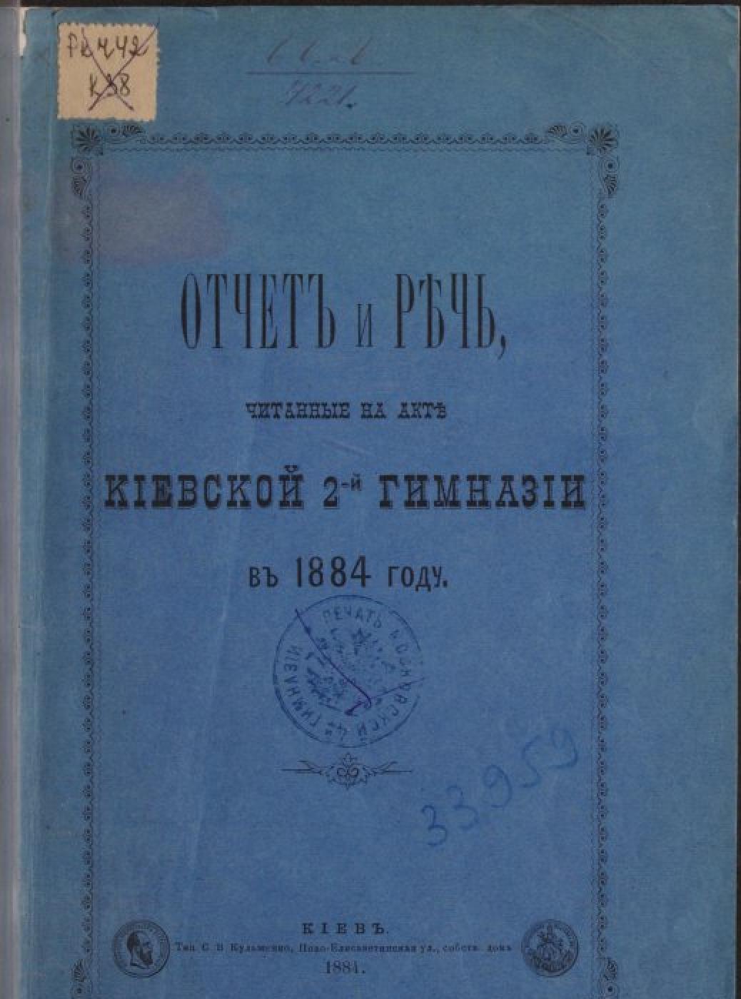 Киевская мужская гимназия. Отчет и речь, читанные на акте Киевской 2-й гимназии в 1884 году [Електронна копія]. Электрон. текст. дан. (1 файл : 44,4 Мб). Киев : Тип. С. В. Кульженко, 1884 (Київ: НБУ ім. Ярослава Мудрого, 2024).