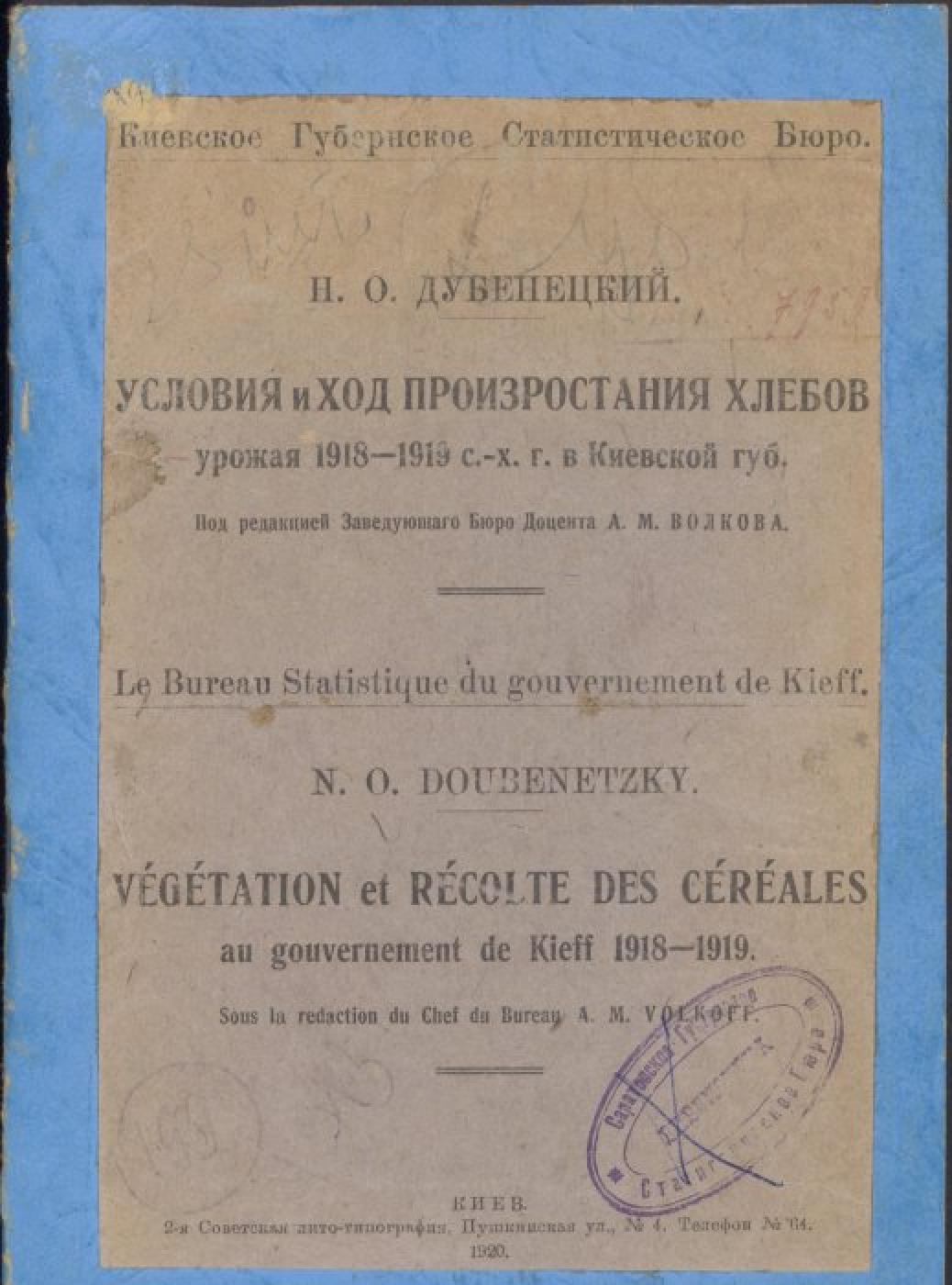 Оригінал друкованого документа зберігається в НБУ ім. Ярослава Мудрого: Дубенецкий Н. О. Условия и ход произрастания хлебов урожая 1918-1919 с.-х. г. в Киевской губ. / Н. О. Дубенецкий ; под ред. А. М. Волкова. — Киев : 2-я Советская лито-типография, 1920. — 33 с. : табл.