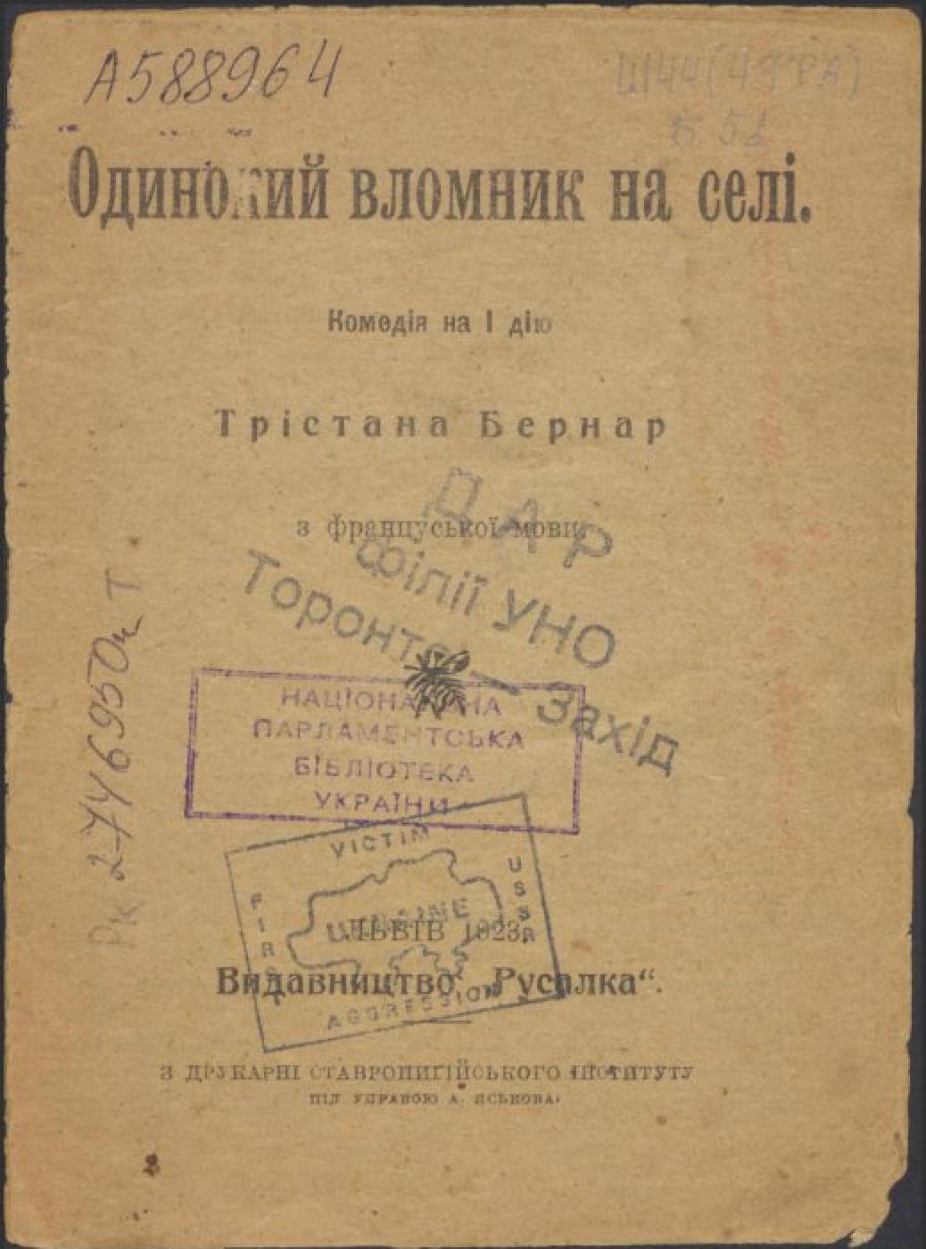 Бернар, Трістан. Одинокий вломник на селі [Електронна копія] : комедія на 1 дію Тpістана Беpнаpа : з фр. мови. Електрон. текст. дані (1 файл : 117 Мб). Львів : Русалка, 1923 (Київ: НБУ ім. Ярослава Мудрого, 2025).