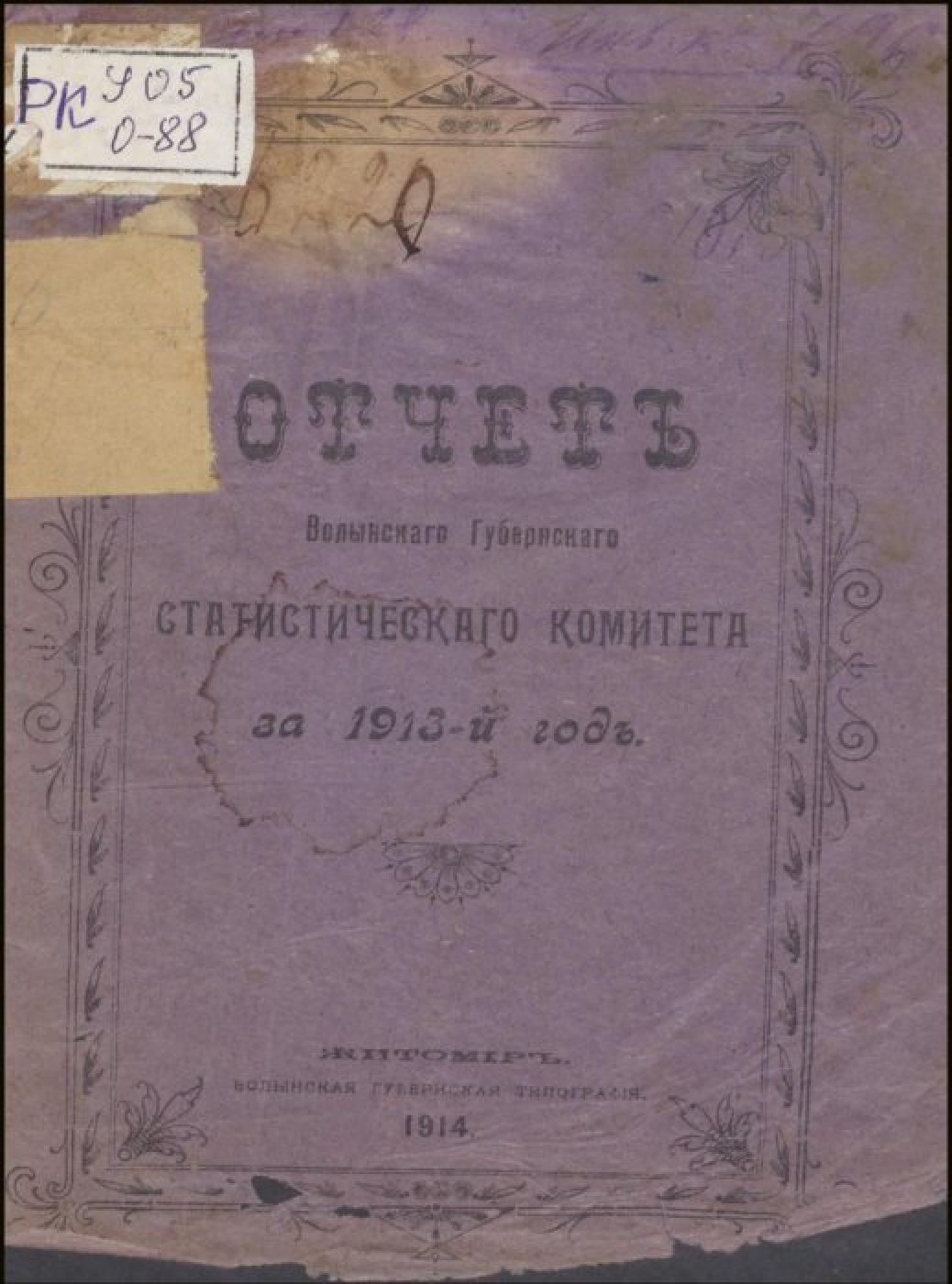 Волынская губерния, Статистический комитет. Отчет Волынского губернского статистического комитета за 1913-й год [Електронна копія]. Электрон. текст. дан. (1 файл : 159 Мб). Житомир : Волын. губерн. тип., 1914 (Київ: НБУ ім. Ярослава Мудрого, 2025).