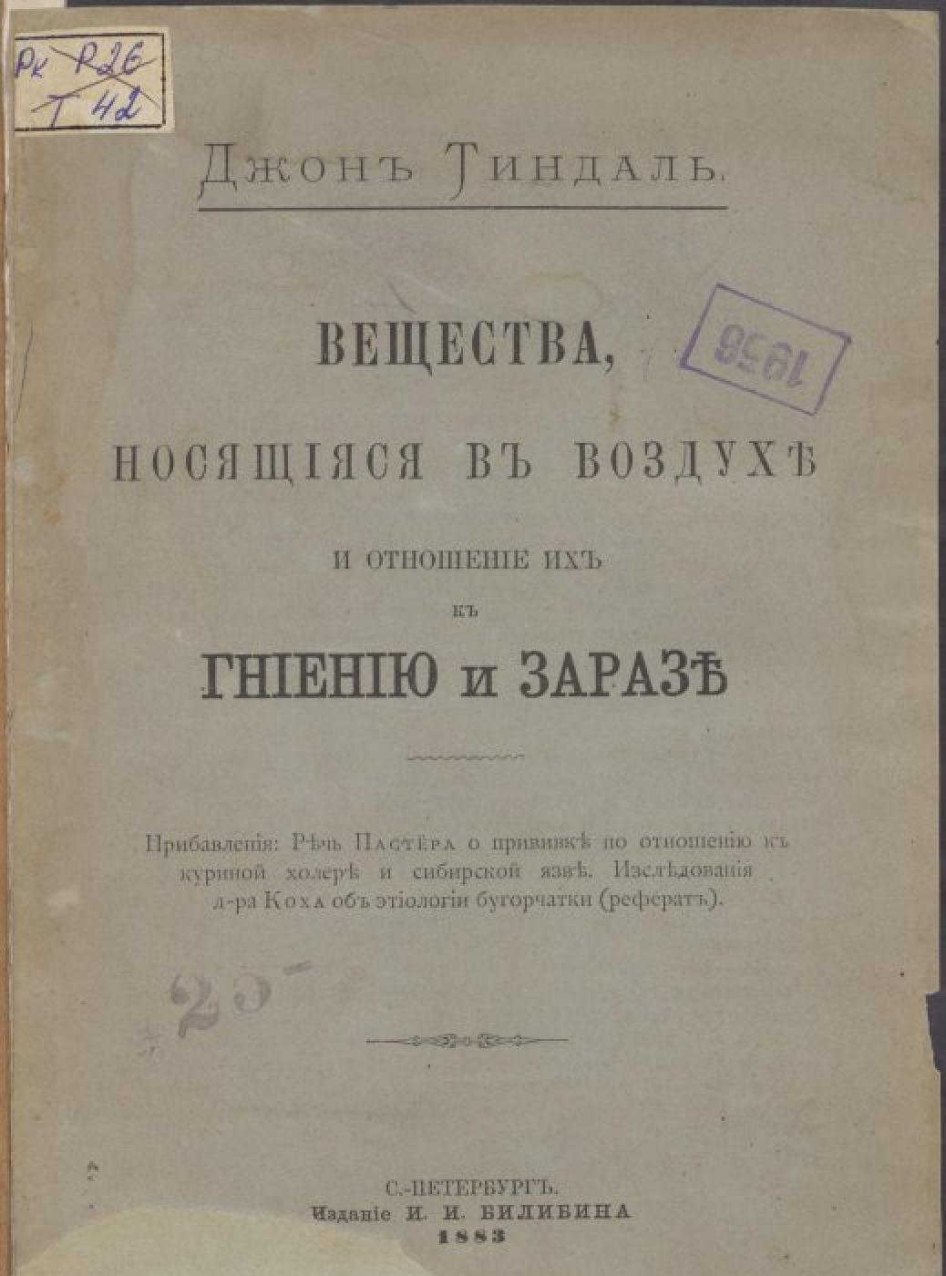Оригінал друкованого документа зберігається в НБУ ім. Ярослава Мудрого: Тиндаль Дж. Вещества, носящиеся в воздухе и отношение их к гниению и заразе / Джон Тиндаль. — СПб. : Изд. И. И. Билибина, 1883. — V, 401, [1] с. : ил.