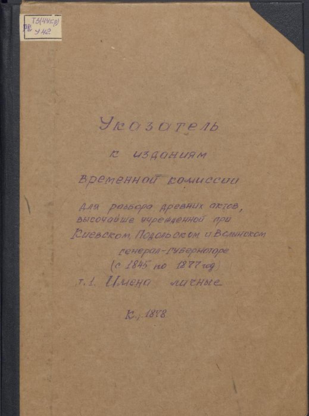 Временная Комиссия для разбора древних актов при Киевском, Подольском и Волынском генерал-губернаторе. Указатель к изданиям Временной комиссии для разбора древних актов, высочайше учрежденной при Киевском, Подольском и Волынском генерал-губернаторе [Електронна копія] : (с 1845 по 1877 год). Электрон. текст. дан. (Київ: НБУ ім. Ярослава Мудрого, 2023). Т. 1 : Имена личные. Электрон. текст. дан. (1 файл : 16,7 Гб). 1878 (Київ: НБУ ім. Ярослава Мудрого, 2025).