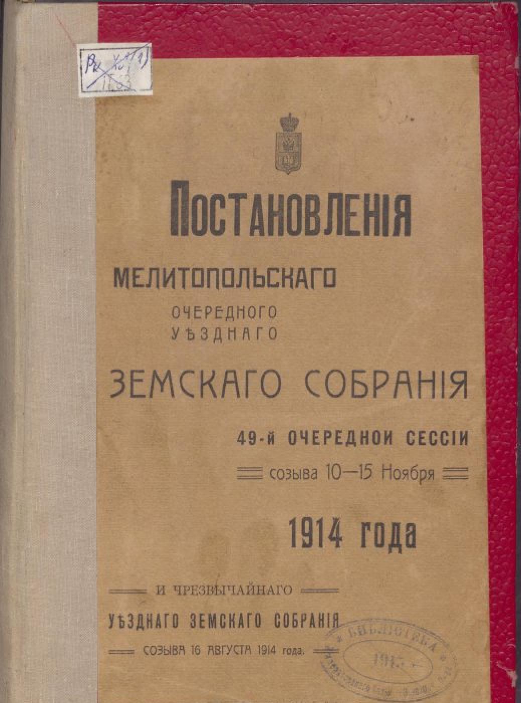 Мелитопольское уездное земское собрание. Постановления Мелитопольского очередного уездного земского собрания [Електронна копія] : 49 очередной сессии созыва 10–15 ноября 1914 г. [и чрезвычайного уездного земского собрания созыва 16 авг. 1914 г. : с докл., отчетами и сметами уездной земской управы]. Электрон. текст. дан. (1 файл : 18,7 Гб). Мелитополь : Тип. Г. Лифшица, 1915 (Київ: НБУ ім. Ярослава Мудрого, 2025).