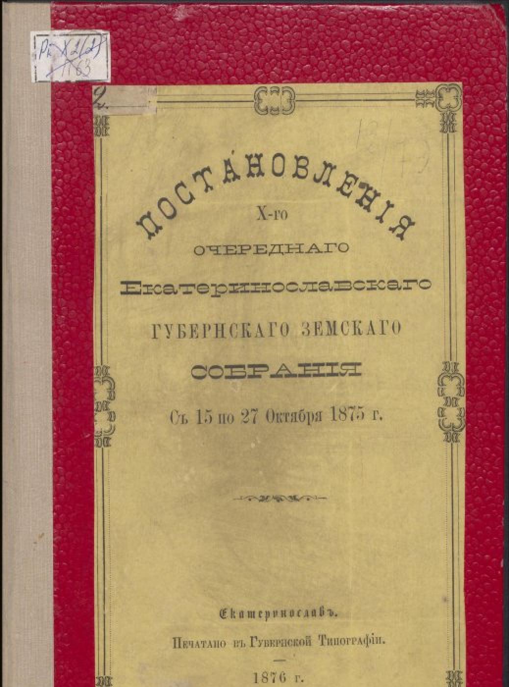 Екатеринославское Губернское Земское собрание. Постановления X-го очередного Екатеринославского Губернского Земского собрания [Електронна копія] : с 15 по 27 окт. 1875 г. Электрон. текст. дан. (1 файл : 11,8 Гб). Екатеринослав : Печатано в Губерн. тип., 1876 (Київ: НБУ ім. Ярослава Мудрого, 2025).