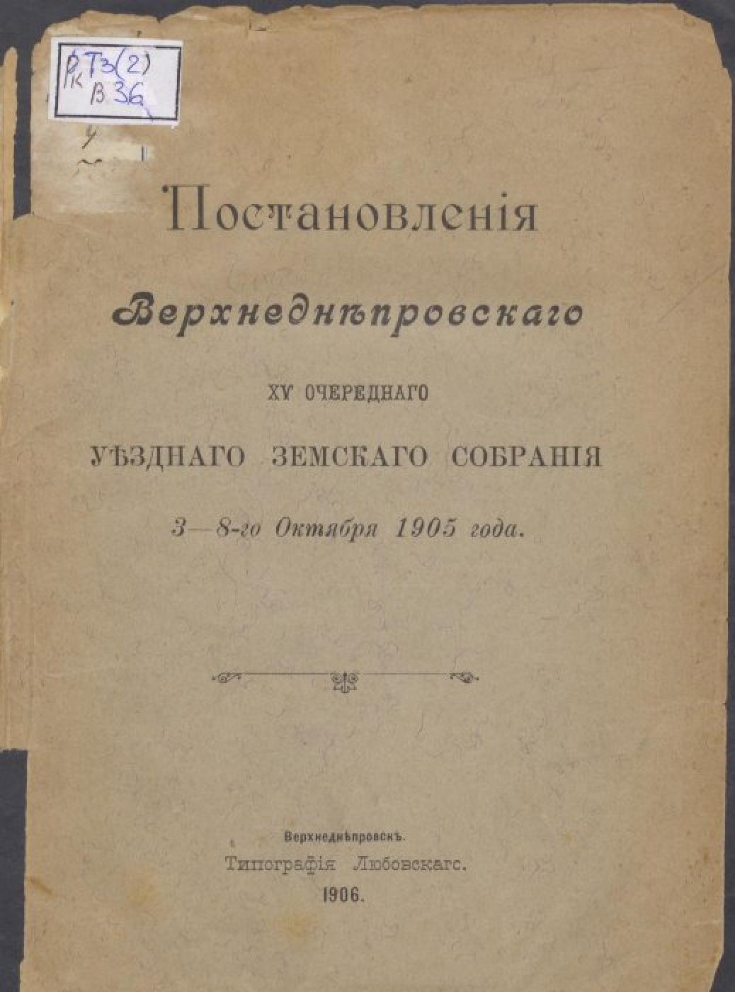 Оригінал друкованого документа зберігається в НБУ ім. Ярослава Мудрого: Постановления Верхнеднепровского XV очередного уездного земского собрания, 3-8 октября 1905 года. — Верхнеднепровск (Днепропетр. обл.) : Тип. Л. Любовского, 1906. — XXVI, 2, 298 с. : табл.