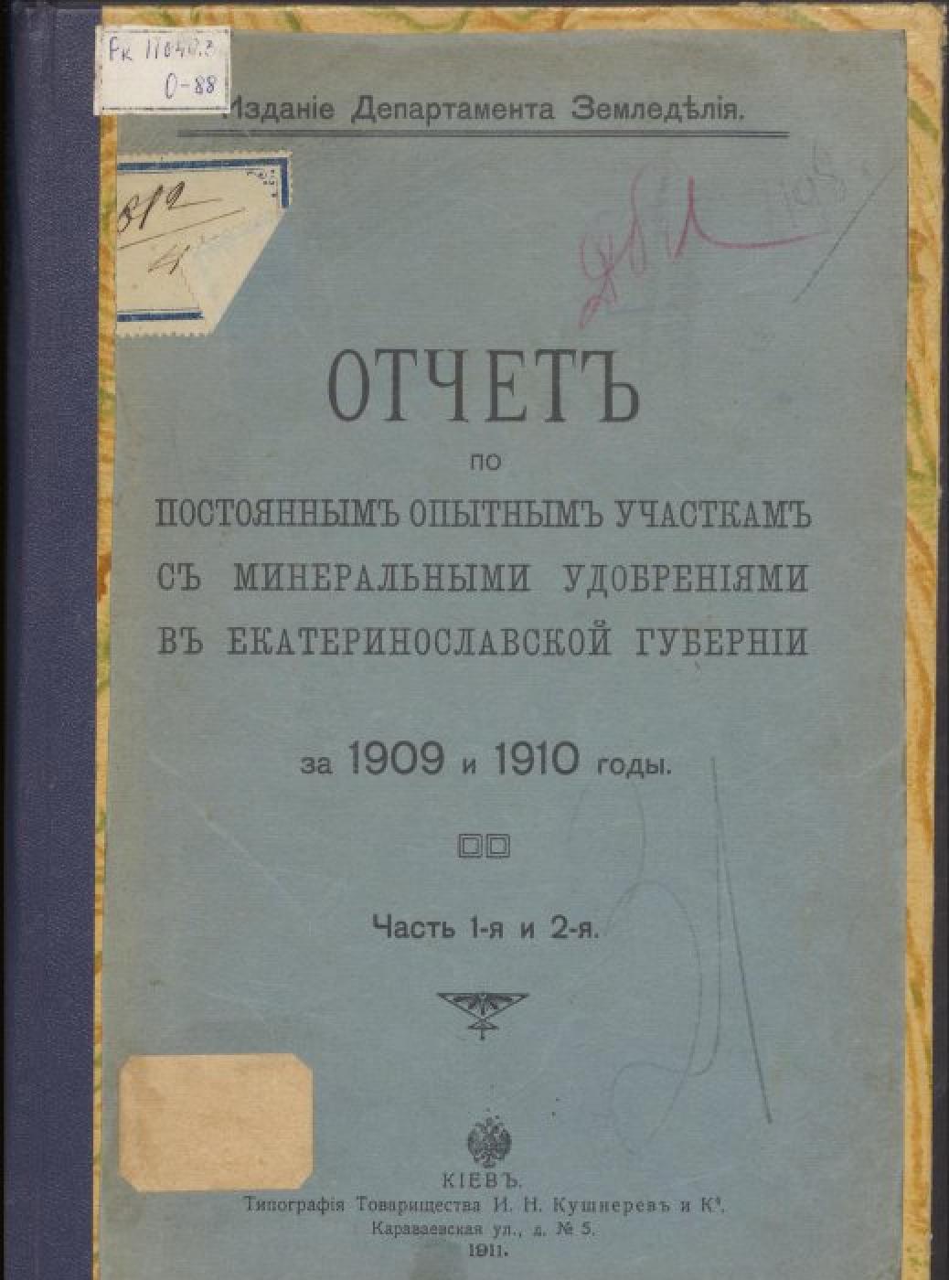 Отчет по постоянным опытным участкам с минеральными удобрениями в Екатеринославской губернии за 1909 и 1910 годы [Електронна копія] / [предисл.: М. З. Воронцов, Ф. П. Сенеко]. Электрон. текст. дан. Киев : Изд. Департамента Земледелия, 1911 (Київ: НБУ ім. Ярослава Мудрого, 2025). Ч. 1 : Электрон. текст. дан. (1 файл : 3,08 Гб). 1911 (Київ: НБУ ім. Ярослава Мудрого, 2025).
