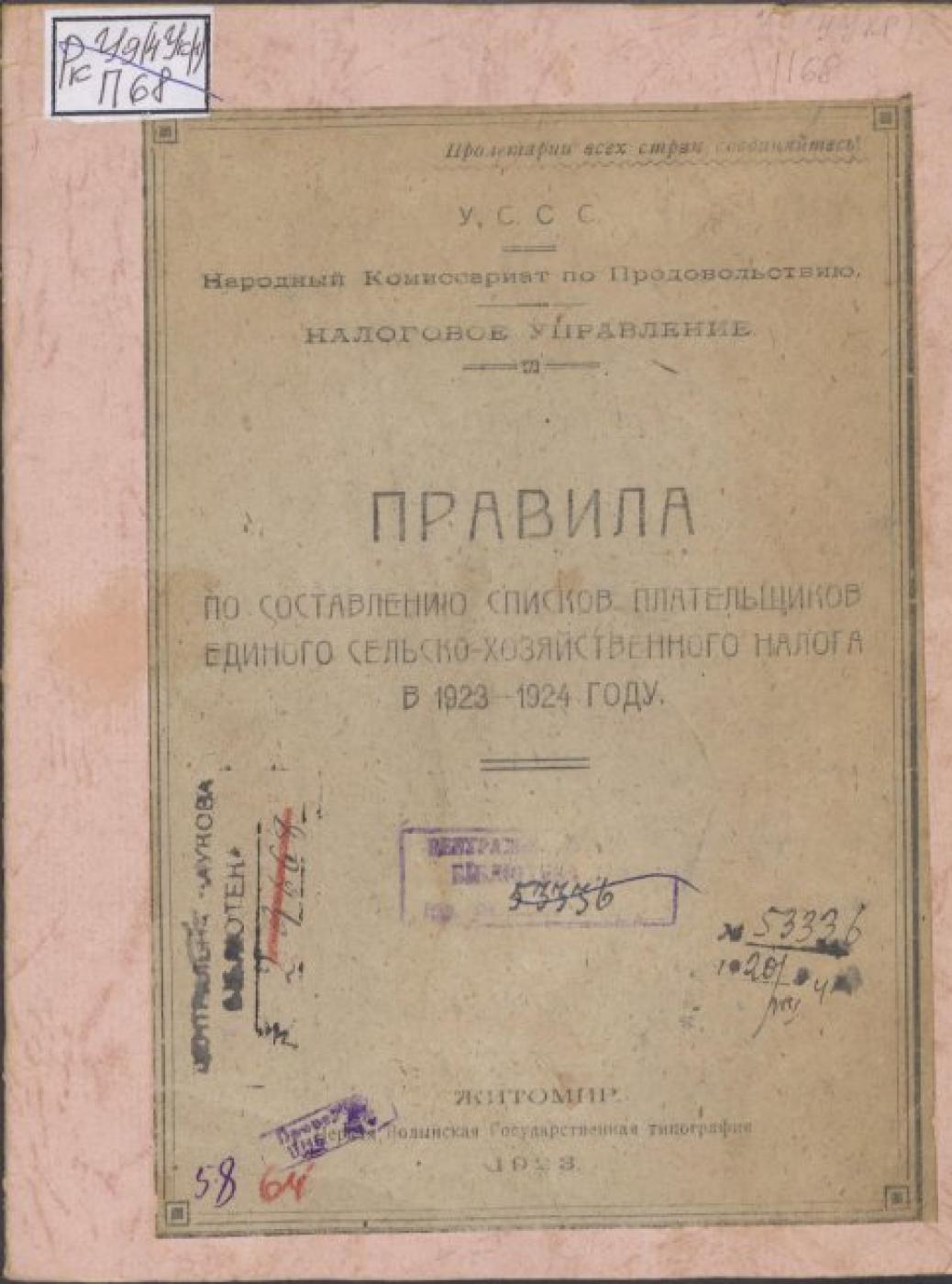 Оригінал друкованого документа зберігається в НБУ ім. Ярослава Мудрого: Правила по составлению списков плательщиков единого сельско-хозяйственного налога в 1923-1924 году / УССС, Нар. комиссариат по продовольствию, Налоговое упр. — Житомир : Первая Волын. гос. тип., 1923. — 16 с.