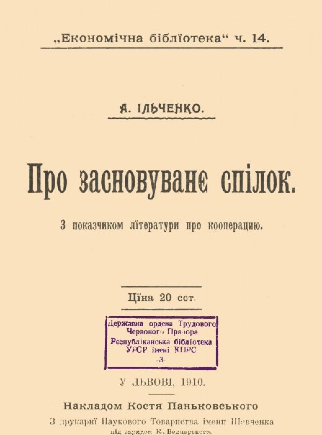 Ільченко, А. Про засновування спілок [Електронна копія] : з покажч. літ. про кооперацію / А. Ільченко. Електрон. текст. дані (1 файл : 5,76 Мб). У Львові : Накладом К. Паньковського, 1910 (Київ: НБУ ім. Ярослава Мудрого, 2021). (Економічна бібліотека; ч. 14).