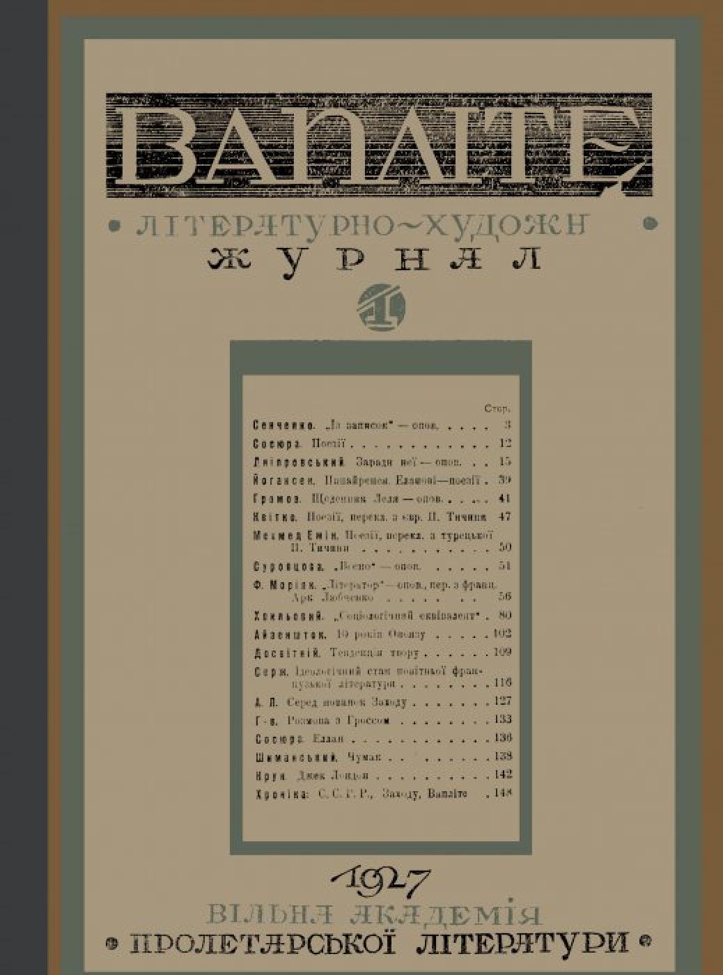 ВАПЛІТЕ [Електронна копія] : літ.-худож. журн. / видає Вільна акад. пролет. літ. Харків : Вільна акад. пролетар. літ., 1927 (Київ : НБУ ім. Ярослава Мудрого). № 1 : Електрон. текст. дані (1 файл : 212 Мб). 1927 (Київ: НБУ ім. Ярослава Мудрого, 2021).