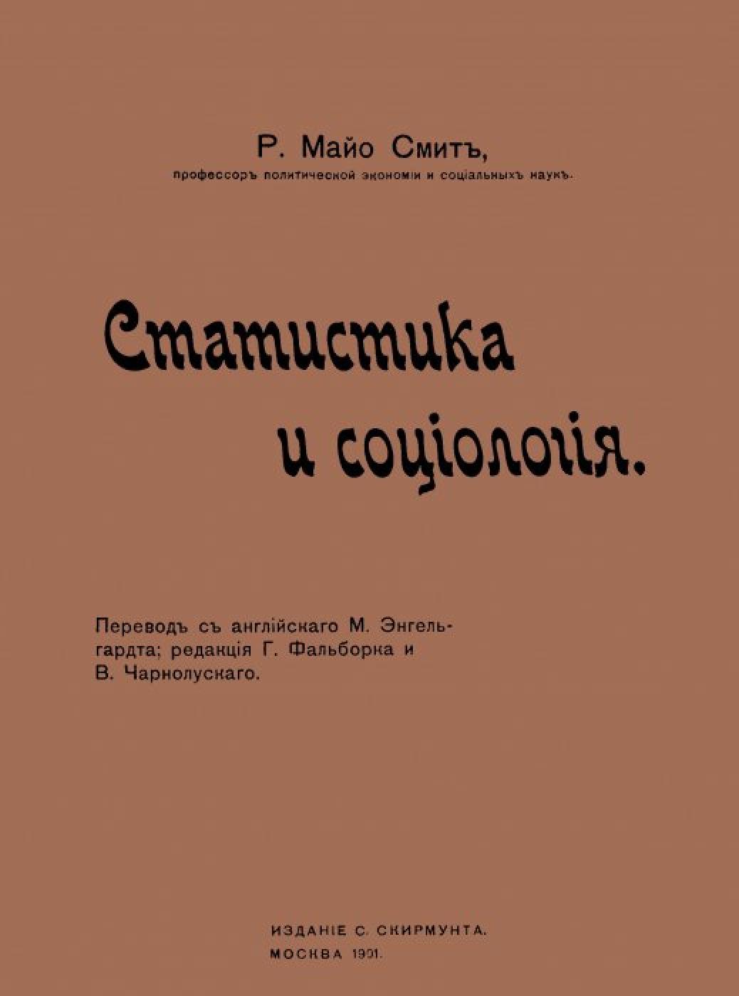 Оригінал друкованого документа зберігається в НБУ ім. Ярослава Мудрого: Майо-Смит Р. Статистика и социология / Р. Майо-Смит ; пер. с англ. М. Энгельгардта ; ред. Г. Фальборка и В. Чарнолуского. — М. : Изд. С. Скирмунта 1900. — 407 с.