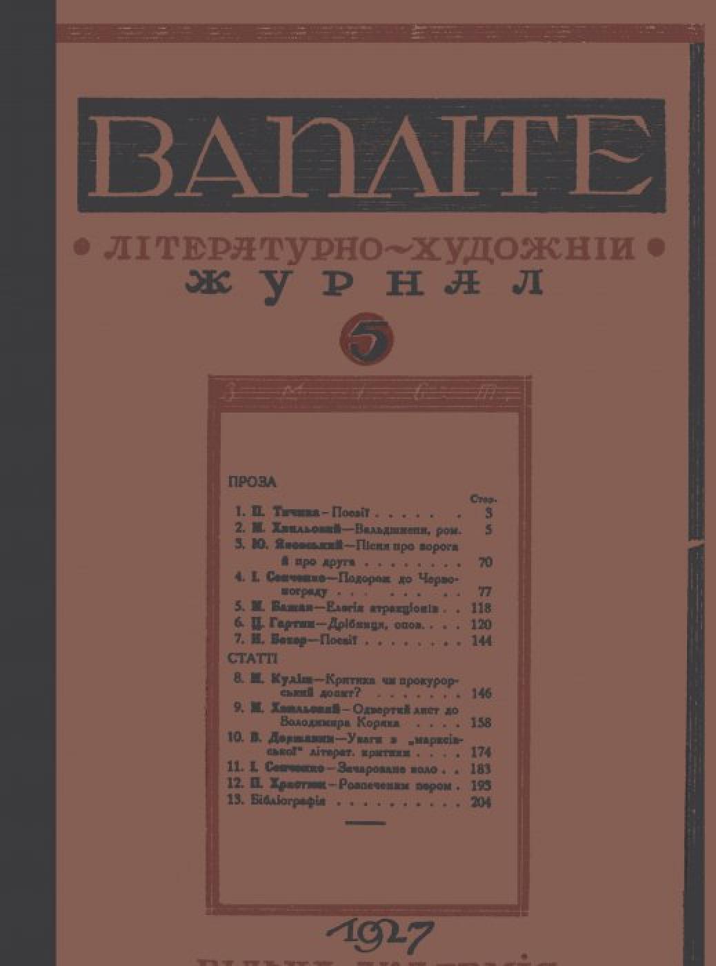 ВАПЛІТЕ [Електронна копія] : літ.-худож. журн. / видає Вільна акад. пролет. літ. Харків : Вільна акад. пролетар. літ., 1927 (Київ : НБУ ім. Ярослава Мудрого). № 5 : Електрон. текст. дані (1 файл : 571 Мб). 1927 (Київ: НБУ ім. Ярослава Мудрого, 2021).