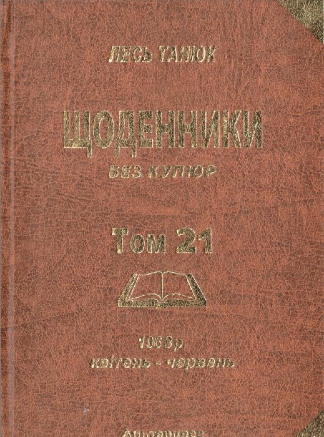 Танюк, Лесь. Твори [Електронна копія] : в 60-и т. / Лесь Танюк. Електрон. текст. дані. Київ : Альтепрес, 2004 (Київ: НБУ ім. Ярослава Мудрого, 2021). Т. 21 : Щоденники без купюр, 1968 р., квітень-червень. Електрон. текст. дані (1 файл : 302 Мб). 2011 (Київ: НБУ ім. Ярослава Мудрого, 2021).