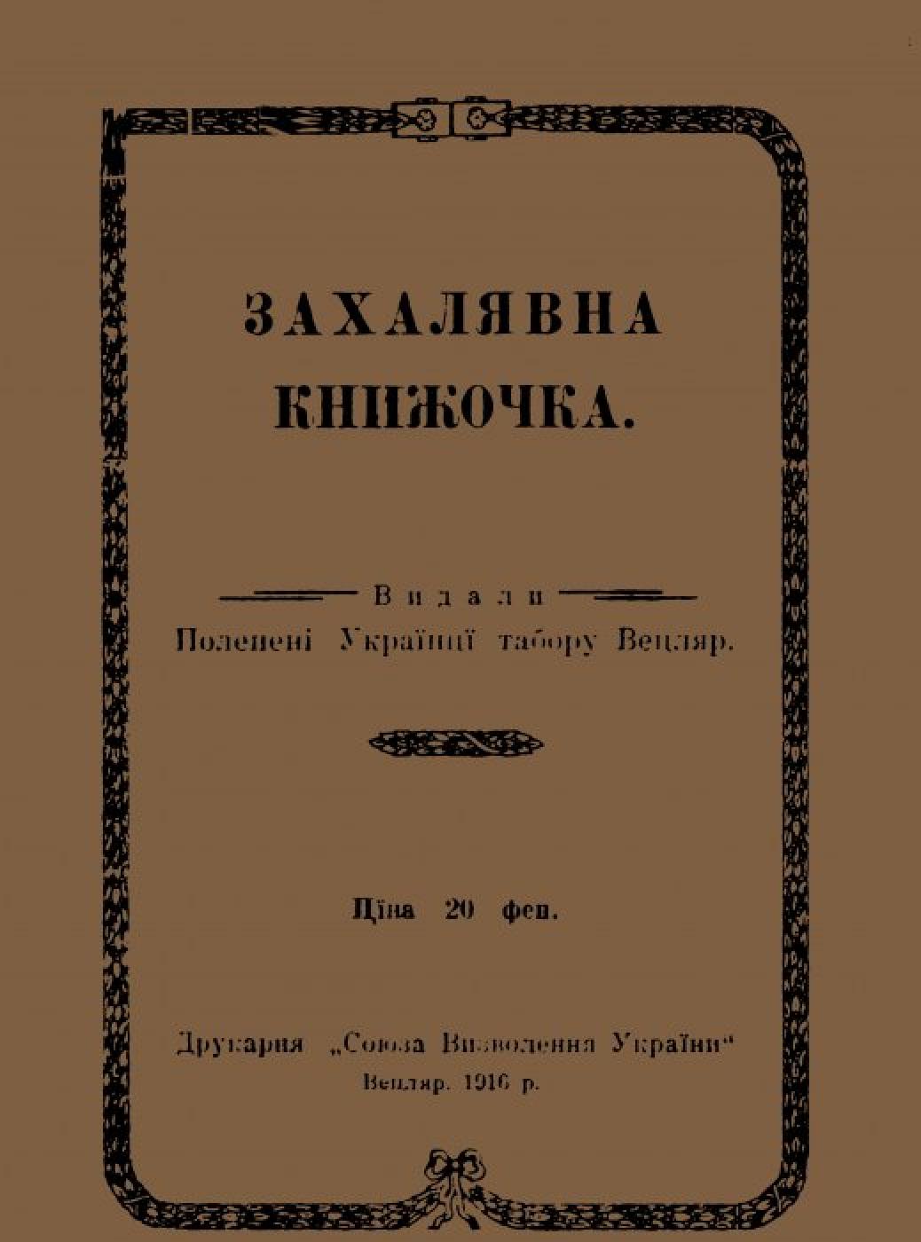 Захалявна книжечка [Електронна копія] : видали полонені українці табору Вецляр. Електрон. текст. дані (1 файл : 21,0 Мб). Вецляр : Друк. ”Союза Визволення України”, 1916 (Київ: НБУ ім. Ярослава Мудрого, 2021).