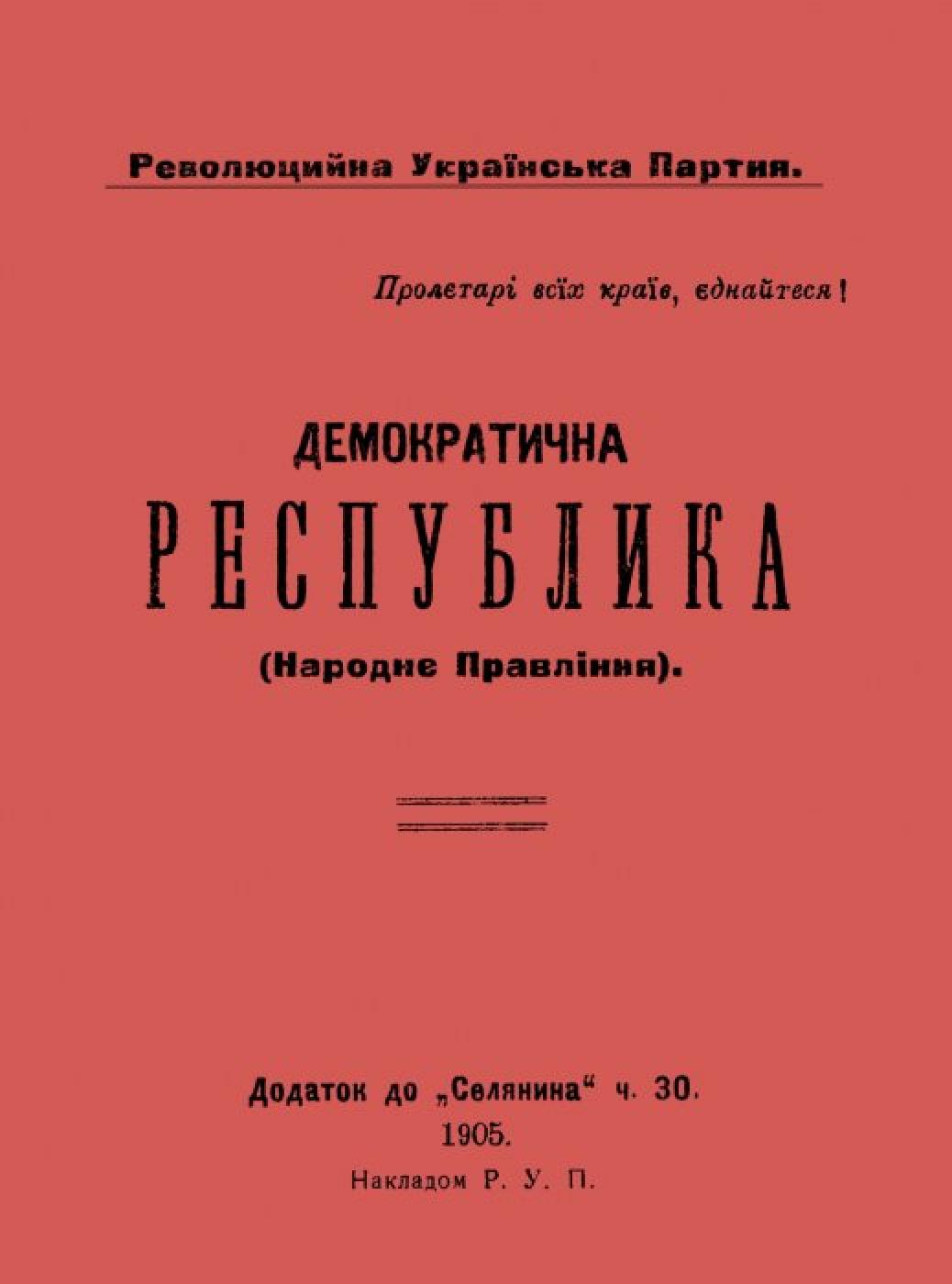Демократична республіка [Електронна копія] : (нар. правління) / Революційна укр. партія. Електрон. текст. дані (1 файл : 52,2 Мб). Львів : Накладом Р. У. П., 1905 (Київ: НБУ ім. Ярослава Мудрого, 2021).