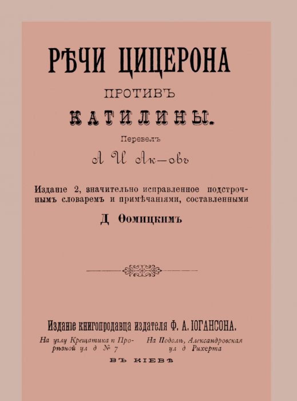 Цицерон, М. Т. Речи Цицерона против Катилины [Електронна копія] / пер. А. И. Ак-овъ. Изд. 2-е, значит. испр. подстроч. с словарем и прим. сост. Д. Фомицким. Электрон. текст. дан. (1 файл : 17,0 Мб). В Киеве : Изд. книгопродавца-изд. Ф. А. Иогансона, 1893 (Київ: НБУ ім. Ярослава Мудрого, 2022).