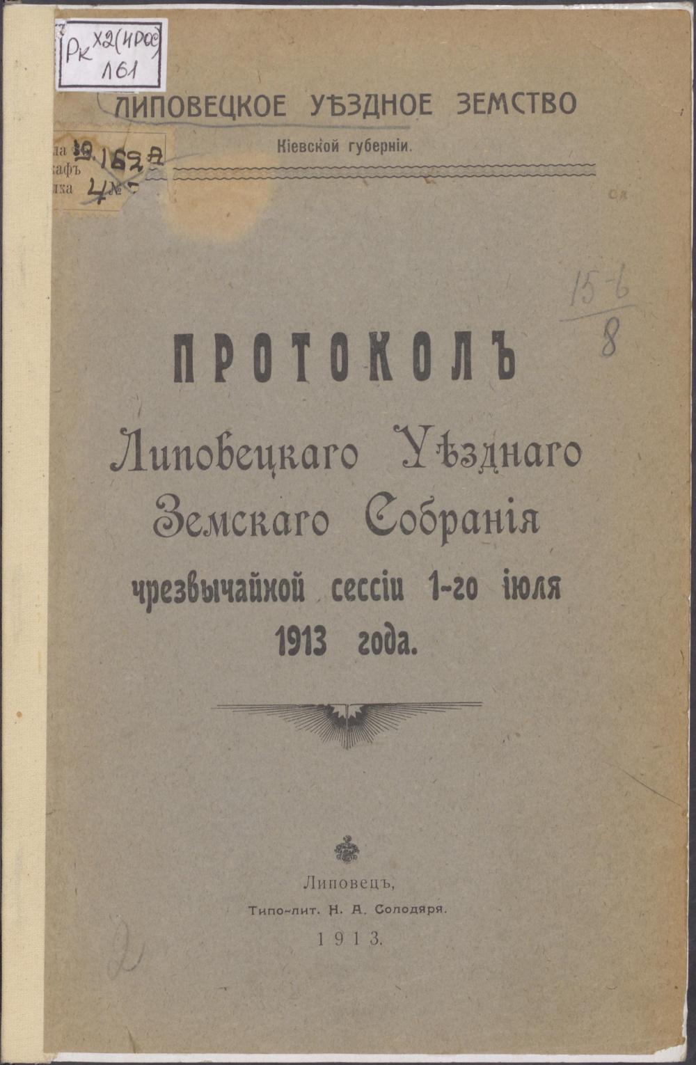 Протокол Липецкого Уездного Земского Собрания чрезвычайной ссесии 1-го Июля 1913 года