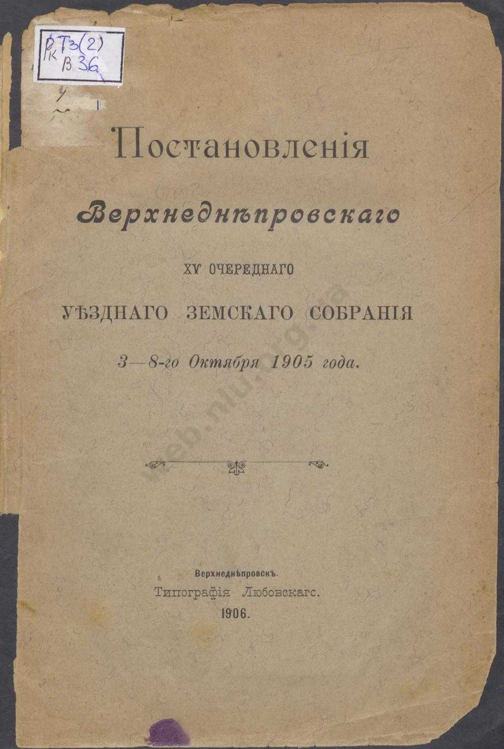 Постановления Верхнеднепровского XV очередного уездного земского собрания 3-8-го октября 1905 года